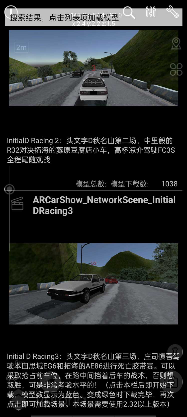 各类3D模型有基础的操作,多个模型在一起又会彼此发生一些新的关联和交互。ARCarShow定义了一个“场景”概念,通常一个场景包括一个环境地形模型,多个可操作驾驶的模型,一种玩法即模式。用户可以在产品中定义自己的场景,也可以直接下载使用ARCarShow提供的场景。用户和ARCarShow一同生成更多的新场景。