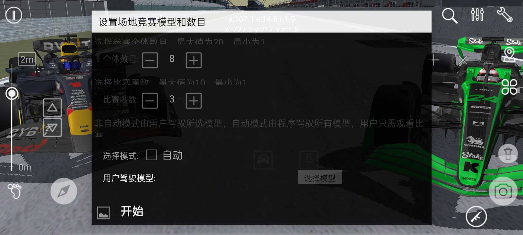 自动模式指所有参赛的模型自动进行比赛,用户可以选择在场地各处观看比赛,也可以放大驾驶小窗,选择驾驶视角观看比赛。